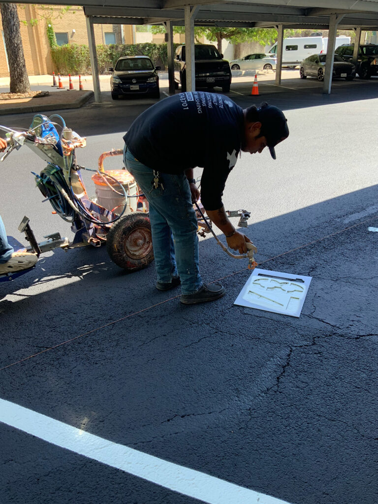 - Sealcoating renews lot surfaces before stenciling for a vivid protective finish.
